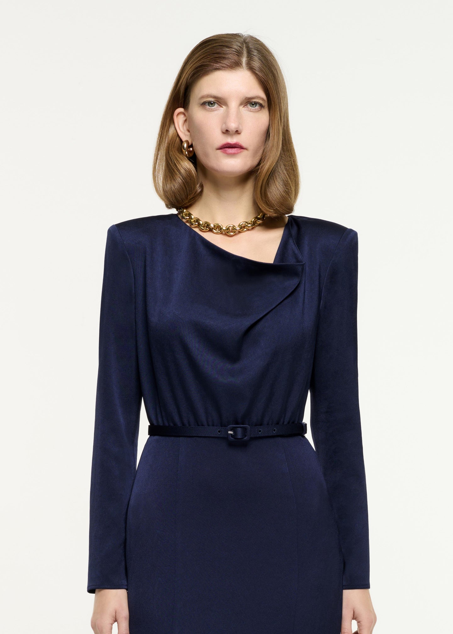 Long sleeve satin crepe midi dress falling to mid calf length in navy. Featuring a cowl drape neckline and a fluted mermaid skirt with a self fabric covered belt.