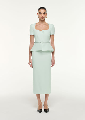 Close up of a model wearing the Peplum Wool Silk Midi Dress in Mint