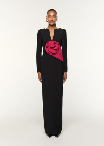 Signal dangerous seduction in this crepe gown, with a sculptural red taffeta rose spotlighting its plunging neckline. A sleek column silhouette adds to its minimalist appeal.