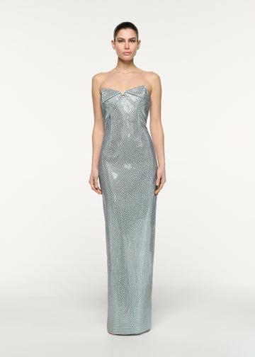 Pure brilliance, this strapless gown steals the spotlight, bedazzled in aqua diamanté for a head-turning statement. Sculpted draping at the bodice amplifies its allure.