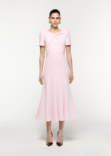 Meet refined elegance in this lightweight pink cady midi dress. A twisted drape bodice and removable shoulder pads sculpt the figure with impact above a flowing, flared skirt.